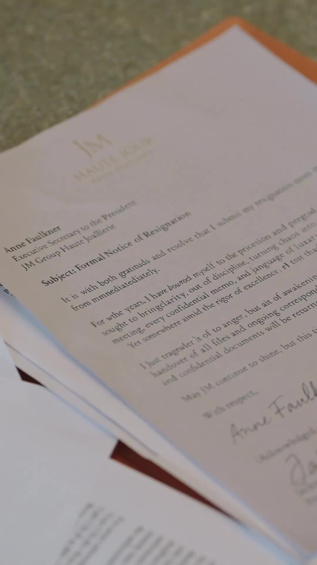 Boss, Your Executive Secretary has Resigned Episodes 3, Anne deeply in love with the Jackson, gives up her position as chief jewelry designer to become his personal secretary and secret lover, until she witnesses the Jackson and his first love Melissa being carried naked into an ambulance after carbon monoxide poisoning. After handling the situation, she decides to resign and return to her career.